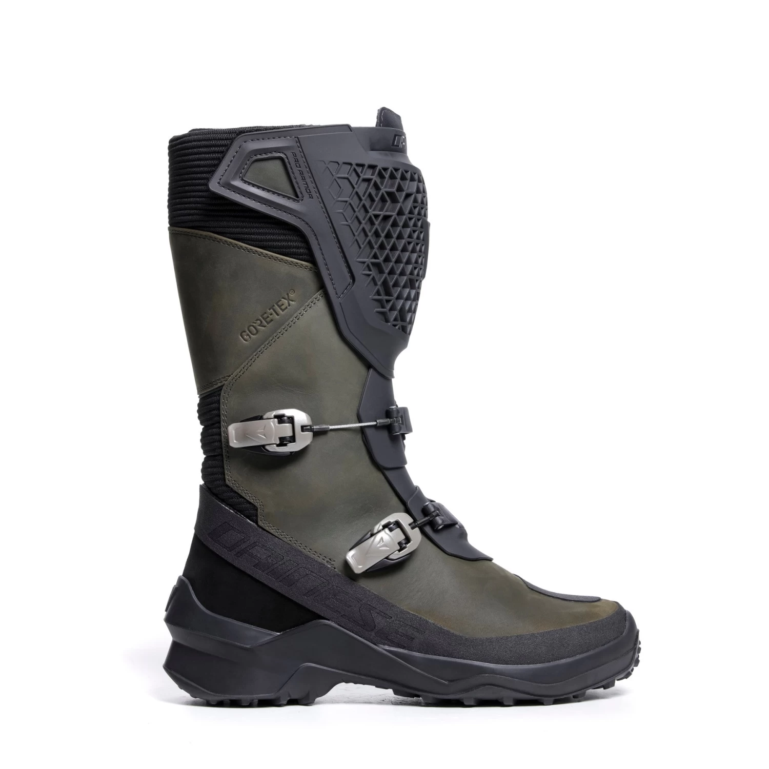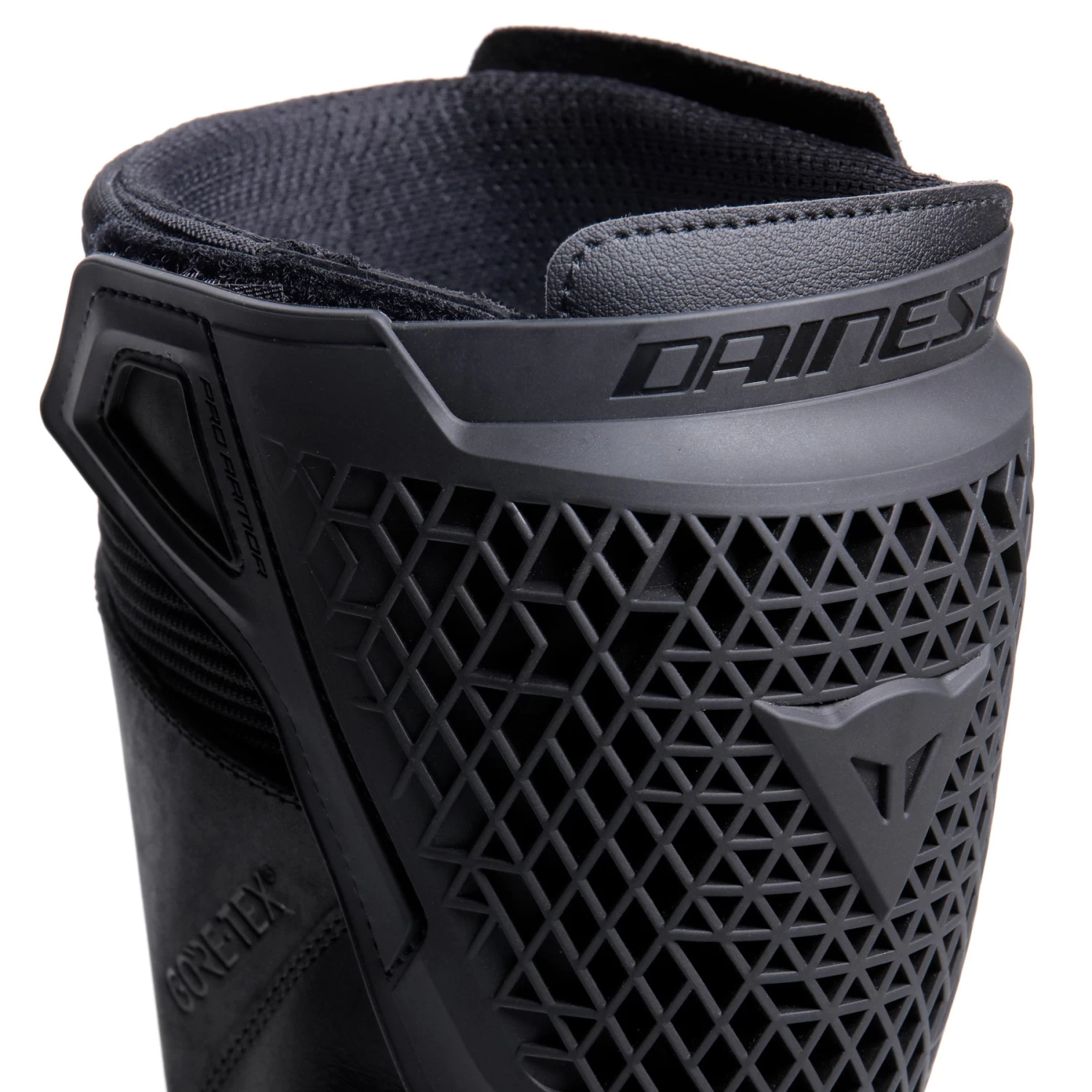 - The Dainese adventure touring boots. Premium leather construction with waterproof and breathable Gore-Tex® Performance membrane. Innovative ProArmor shin guard and double metal lever closure.