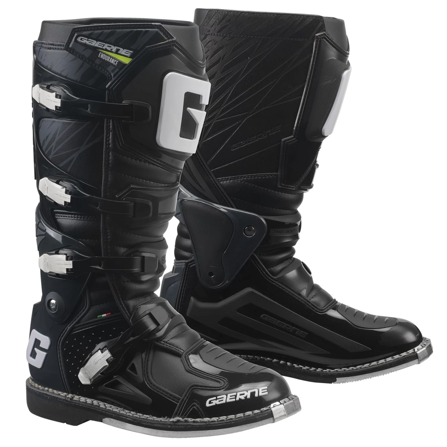 This innovative boot has a sleek new look. Partially due to the exclusive Gaerne wraparound ankle pivot system. This lightweight feature allows the rider more ankle support while maintaining a comfortable fit. New alloy buckles, heavy-duty burn guard, toe bumper and the trademark Gaerne sole give the fastback endurance its distinctive look.