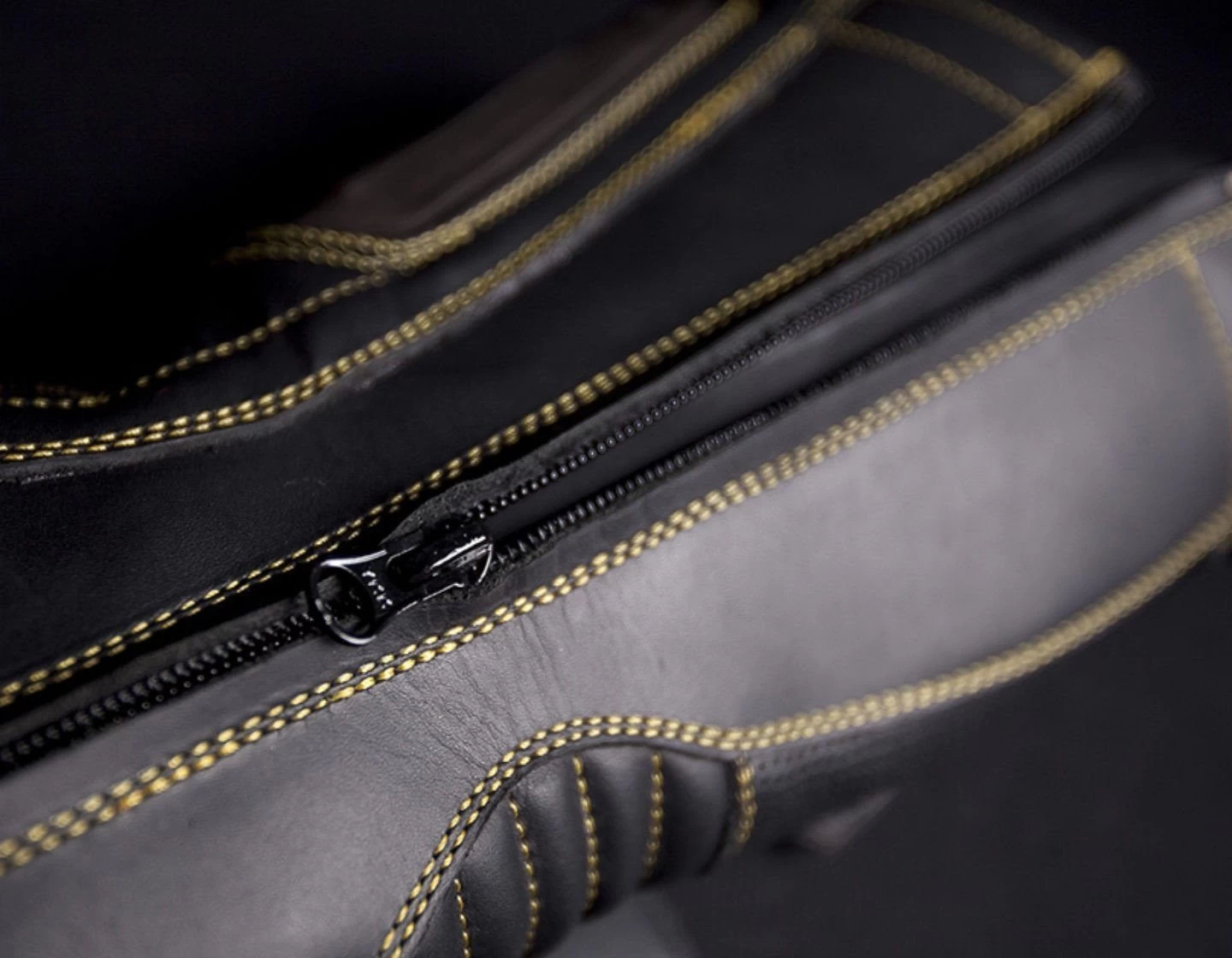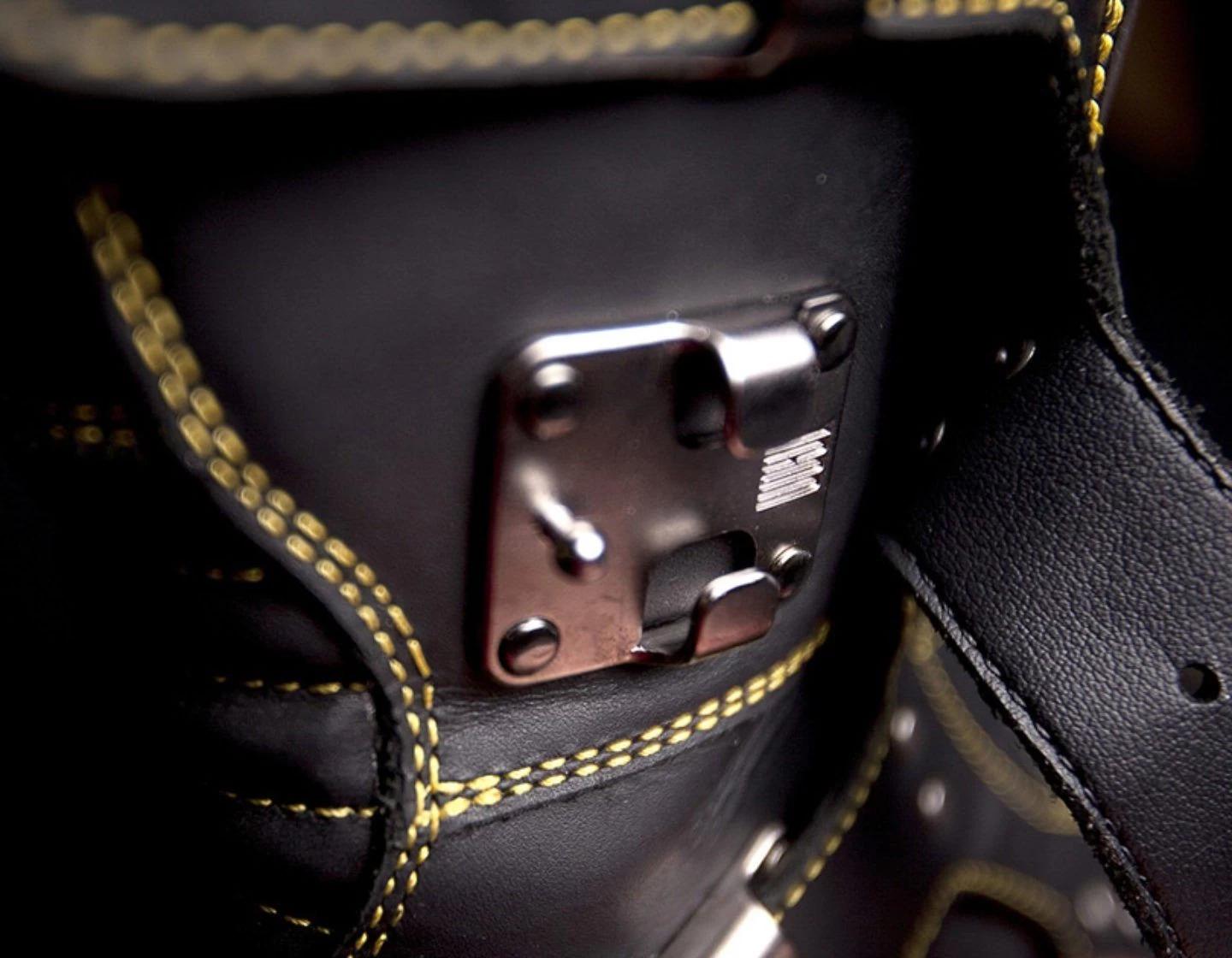 Internal ankle plate, Cast metal buckles, Stamped metal heel plate, Heat pressed leather shifter panel, Heat pressed leather shin plate, YKK® zippers.
